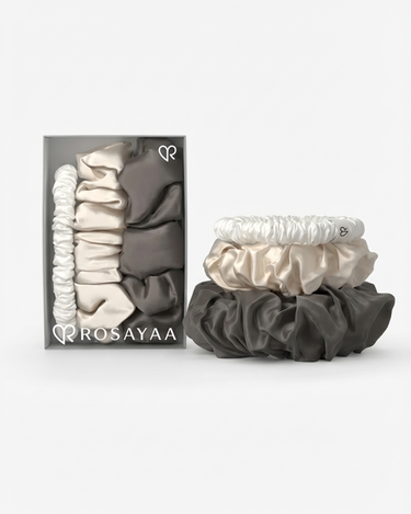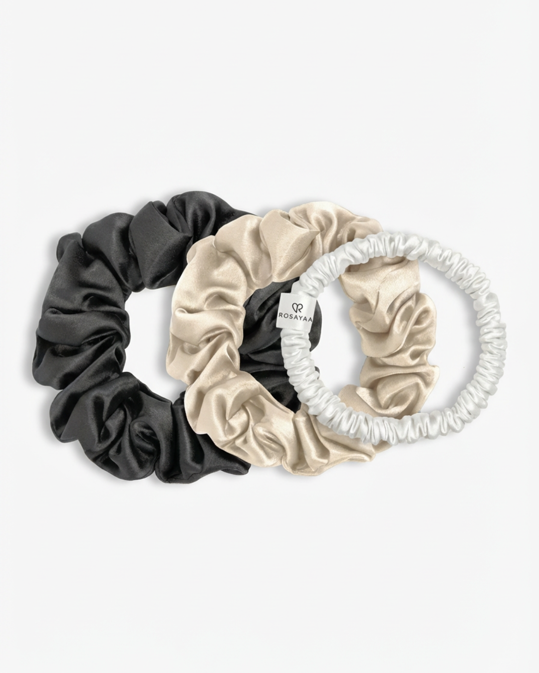 Our scrunchies are crafted from premium mulberry silk, the same luxurious material as our award-winning pillowcases. Unlike regular hair ties that pull and snag, silk glides smoothly through your hair for a secure hold without the breakage.
